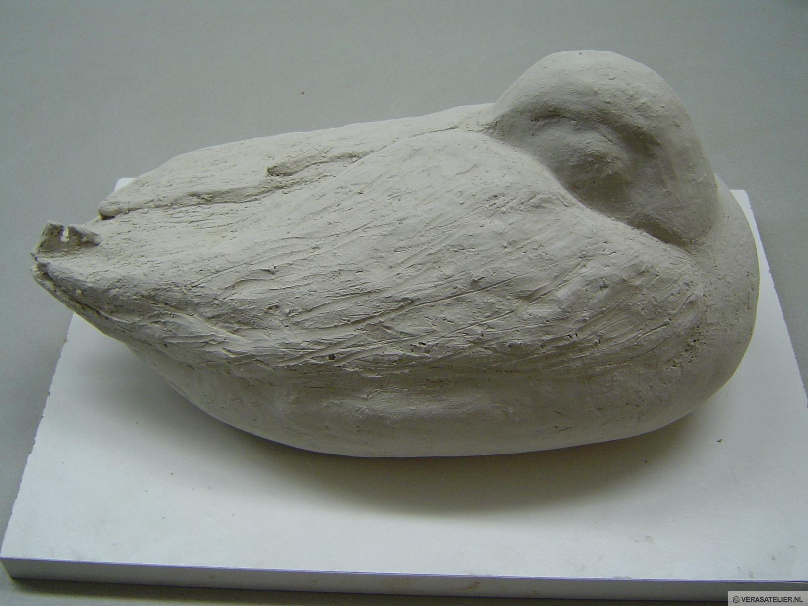 Tijdens het maakproces: de eend is klaar voor de Biscuit stook. Onderste foto mijn inspiratie: Slapende eenden in de tuin.