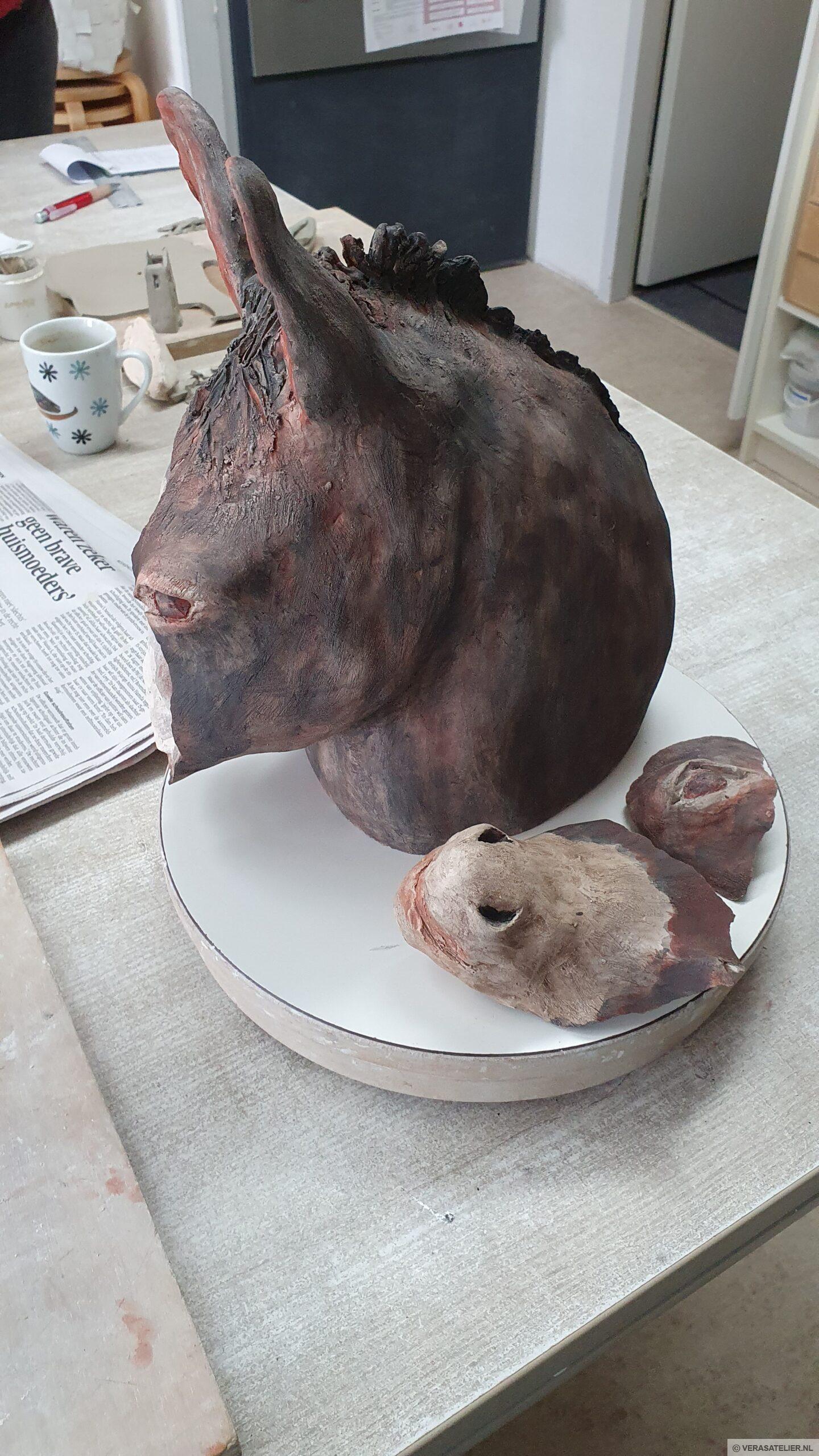 Foto's: diverse lagen Oxides, Mangaan en IJzer. Na de biscuit stook verder bewerkt in de Japanse Kintsugi Techniek. Onderste foto: wandeling met ezeltje Ria.