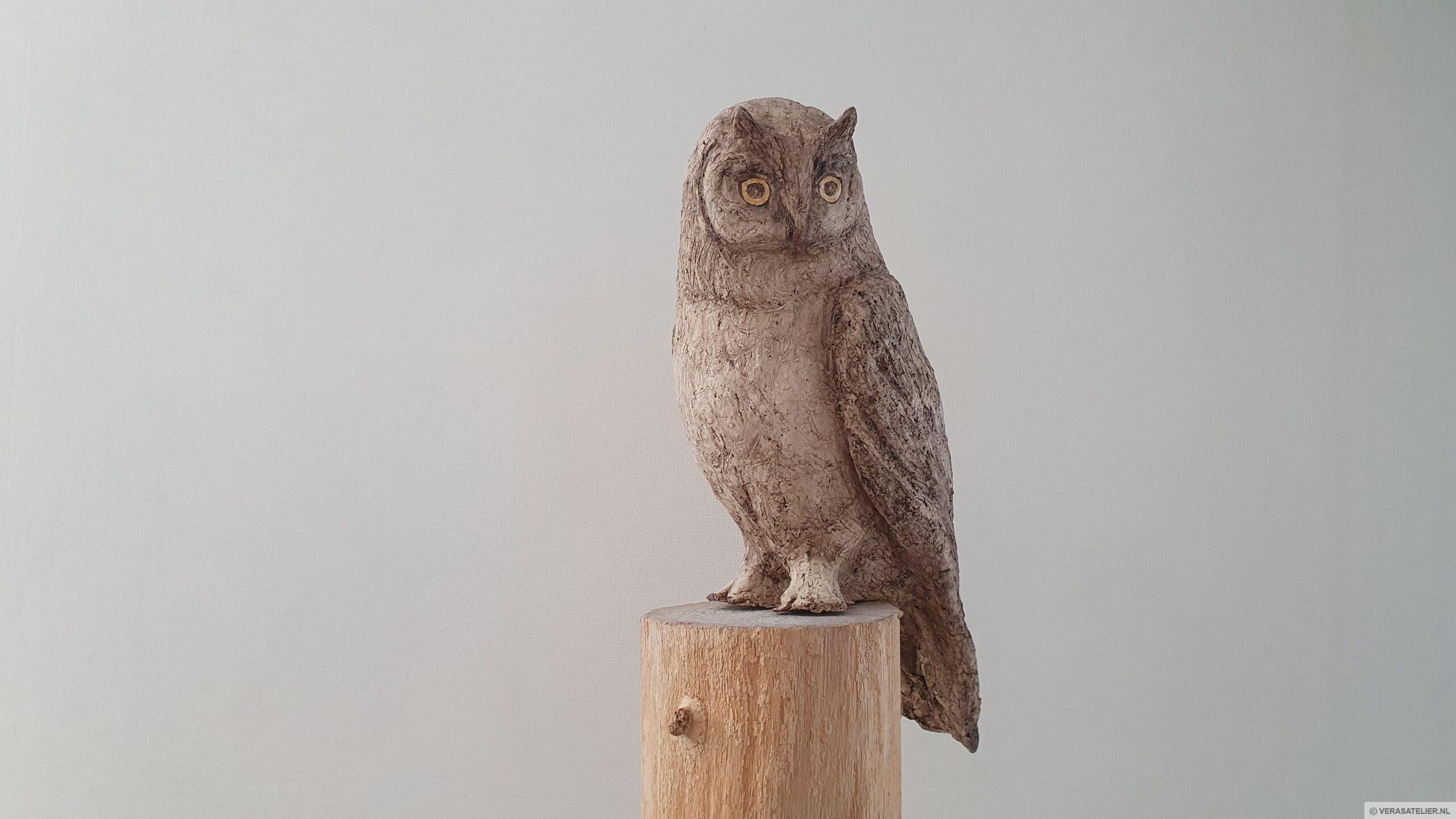 Bovenstaande foto's: de Ransuil en Schilderij Eidereend op een expositie, en de uil op de boomstam te zien vanuit verschillende hoeken.